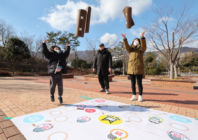 설 연휴 마지막 날인 30일 오후 부산 기장군 정관박물관을 찾은 가족들이 윷놀이하며 즐거운 시간을 보내고 있다. 정관박물관은 설 연휴 동안 박물관을 찾는 관람객을 위해 투호 던지기와 제기차기 등 전통 민속놀이 체험을 운영했다.