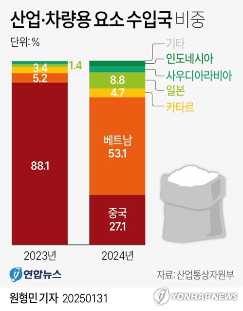 실제로 중국산 산업용·차량용 요소 수입 비중은 2023년까지만 해도 88.1%로 주요 수입국 중 가장 높았지만, 작년에는 27.1%에 그쳤다. 작년 산업용·차량용 요소 수입 비중이 가장 높은 곳은 베트남(53.1%)이었고, 다음으로 중국(27.1%), 일본(8.8%), 카타르(4.7%), 사우디아라비아(3.4%), 인도네시아(2.9%) 등 순이었다.