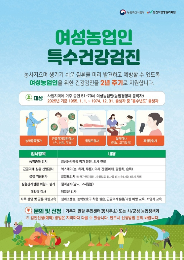 올해 검진 대상은 만 51~70세 여성농업인 중 홀수년도 출생자가 대상이다. 1955년 1월 1일부터 1974년 12월 31일 출생자다. 주소지 관할 주민센터 또는 시군구에 신청해 검진 절차를 안내받을 수 있다.