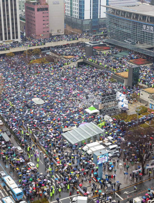 비가 내리는 궂은 날씨에 우산을 쓴 참가자들은 ‘탄핵 폭주’ ‘내란 선동’ 등 피켓들을 들고 모였다. 집회 내내 광장에는 “윤석열 대통령” “싸우자” “이기자” 등 구호가 울려퍼졌다. 탄핵 반대 집회는 부산뿐 아니라 서울, 인천, 울산, 진주, 포항, 춘천 등 전국 각지에서 동시다발적으로 열리고 있다. 시간이 갈수록 보수층 내 극우를 중심으로 집회가 열린다는 예상과 달리 2030 청년과 여성 등까지 참여가 확산하고 있다.