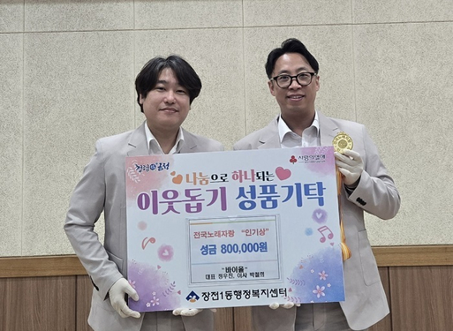 바이올 정우진 대표와 박철희 이사는 최근 전국노래자랑에 출연해 인기상 상금으로 받은 80만 원 전액을 부산 금정구 장전1동에 기탁했다.