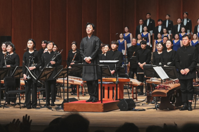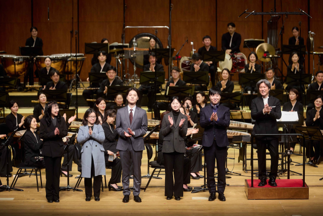 지난 1월 18일 서울 국립극장 해오름에서 열린 제16회 아르코한국창작음악제(아.창.제) 커튼콜 모습. 이날 김성국이 지휘한 국립국악관현악단은 이정호 작곡가의 국악관현악 ‘아부레이수나’ 등 5곡을 선보였다. 이정호 제공
