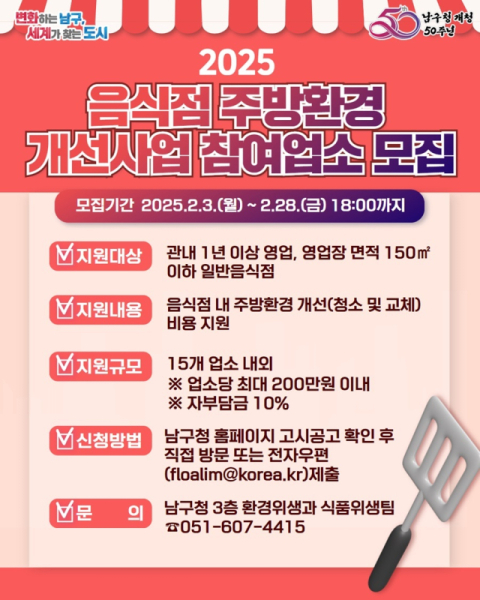 부산 남구(오은택 구청장)는 개청 50주년을 맞이하여 영세 음식점을 대상으로 노후화된 주방시설 교체 및 청소비용을 지원하는 2025년 음식점 주방환경 개선사업을 시행한다고 밝혔다.