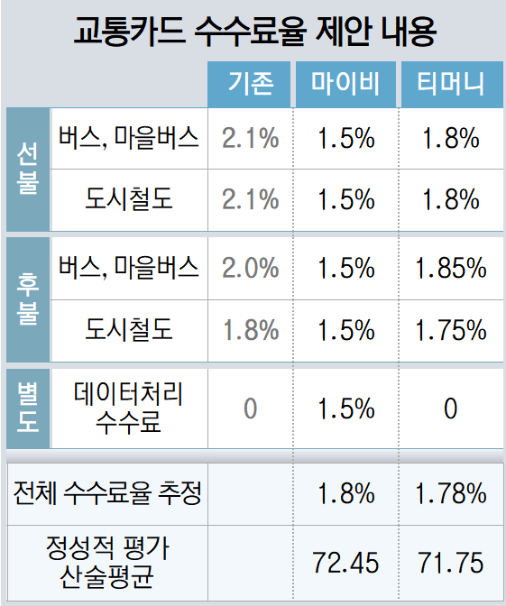 특히 부산시가 지난해 11월 사업자 입찰 제안을 하며 “수수료율 결정 시 교통 운영 기관이 부담하는 수수료율은 현행보다 동등 또는 낮게 설정하여야 한다”고 못박은 만큼, 수수료율은 입찰 참가자에게나 평가위원들에게나 심사에서 가장 결정적인 요소로 작용했다.