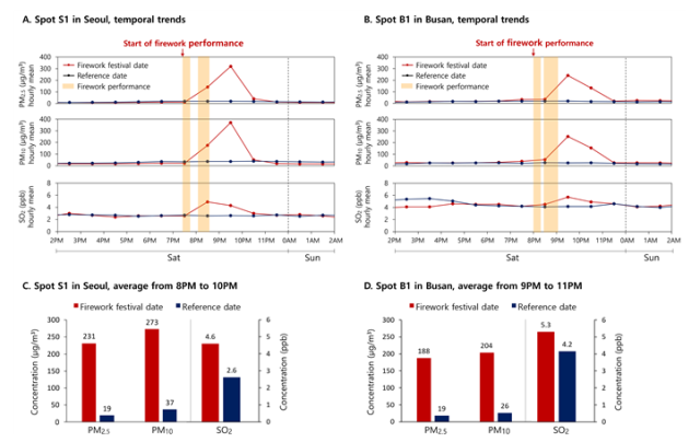 또한 불꽃놀이 후 2시간 평균 농도를 분석한 결과, 서울은 231µg/㎥, 부산은 188µg/㎥로 나타났다. 이는 일주일 전후로 동일 요일, 동일 시간, 동일 위치 2시간 평균 농도 서울 19µg/㎥, 부산 19µg/㎥와 대비해 서울은 12배, 부산은 7배가 증가한 수치이다.