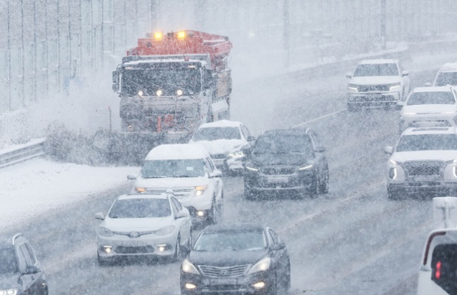 설 전날인 28일 대설 경보가 발효 중인 경기도 용인시 경부고속도로 수원신갈IC 부근에서 제설차가 눈을 치우고 있다. 연합뉴스