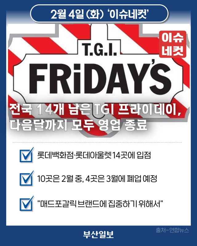 패밀리 레스토랑 TGI 프라이데이스가 영업을 종료합니다. 4일 외식업계에 따르면 엠에프지코리아는 매드포갈릭 브랜드에 집중하기 위해 TGI 프라이데이스 브랜드 운영을 종료하고, 매장 임대차 계약 기간에 따라 순차적으로 매장 문을 닫을 예정입니다. TGI 프라이데이스는 롯데백화점과 롯데아울렛 일부 지점 등에 입점해 있습니다. 14개 매장 중 10개가 이달 중에 문을 닫고, 나머지 4개 매장은 다음 달에 영업을 마칩니다.