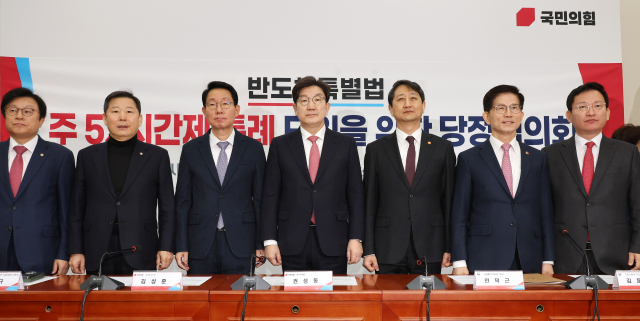 국민의힘 권성동 원내대표와 안덕근 산업통상자원부 장관, 김문수 고용노동부 장관 등 참석자들이 4일 국회에서 열린 반도체특별법 주52시간제 특례 도입을 위한 당정협의회에 앞서 기념 촬영을 하고 있다. 왼쪽부터 박형수 원내수석부대표, 이철규 국회 산업통상자원중소벤처기업위원회 위원장, 김상훈 정책위의장, 권성동 원내대표, 안덕근 산업통상자원부 장관, 김문수 고용노동부 장관. 연합뉴스