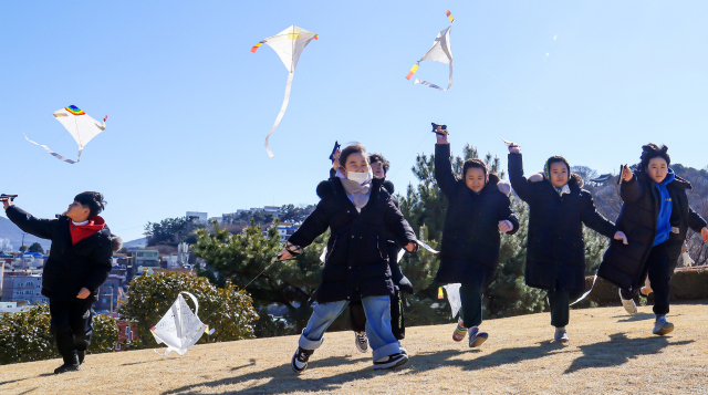 부산 지역 전통 연인 동래연 제작 기술을 보유한 배무삼 지연장(紙鳶匠)과 함께하는 창작연 만들어 날리기 행사가 8일 복천박물관에서 열렸다. 어린이들이 지연장과 함께 만든 창작연을 행사를 위해 임시 개방된 복천동고분군에서 날리고 있다.