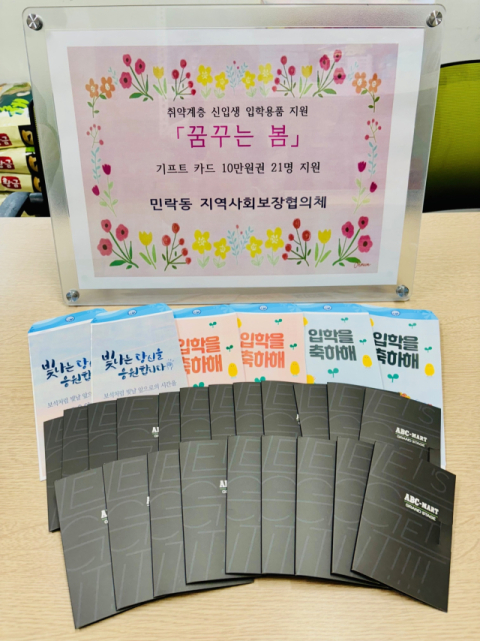 부산광역시 수영구 민락동 행정복지센터(동장 박해원)는 민락동 지역사회보장협의체(위원장 유병일) 주관으로 관내 취약계층 자녀들 중 2025년 초·중·고 신입생 21명을 대상으로 '꿈꾸는 봄' 사업을 추진한다고 밝혔다.