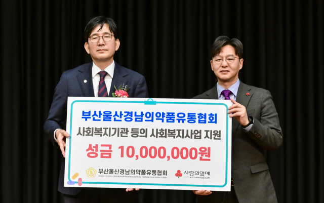 부산울산경남의약품유통협회(회장 서영호)는 지난 10일 제58회 정기총회를 맞아 부산 농심호텔 대청홀에서 부산사회복지공동모금회(회장 이수태·부산사랑의열매)에 1000만 원의 성금을 기부하며, 지역사회 나눔 실천에 앞장섰다.