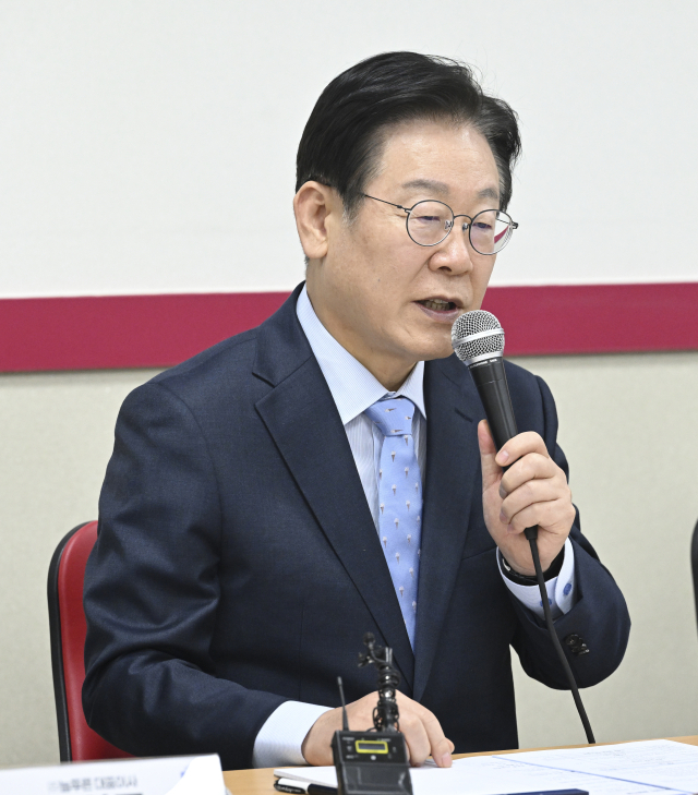 더불어민주당 이재명 대표가 11일 경기 화성시 팔탄면 아비만엔지니어링에서 열린 경영악화 수출기업 애로청취 현장간담회에서 인사말을 하고 있다. 연합뉴스