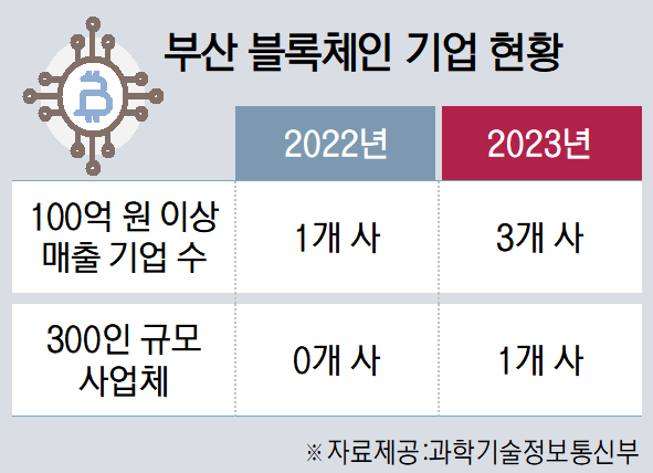 부산은 수익성이 확대되는 블록체인 기업과 이에 따른 일자리 창출이 점차 늘고 있는 것으로 조사됐다. 같은 해 100억 원 이상의 매출을 기록 중인 전국 블록체인 기업 수는 92개 사다. 이중 부산은 3개 사(3.3%)로 전년 대비로는 2개 사 늘었다. 특히 2022년 0%였던 부산의 300인 이상 종사자 사업장도 탄생했다. 전국에서 이 같은 규모의 블록체인 업체는 27곳 뿐이다.