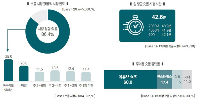 이번 설문에서 응답자 86.4%가 ‘숏폼 시청 경험이 있다’고 답했으며 이중 ‘하루에도 여러 번 본다’(30.5%)와 ‘매일 본다’(20.8%)고 답한 응답자는 절반을 넘었다.