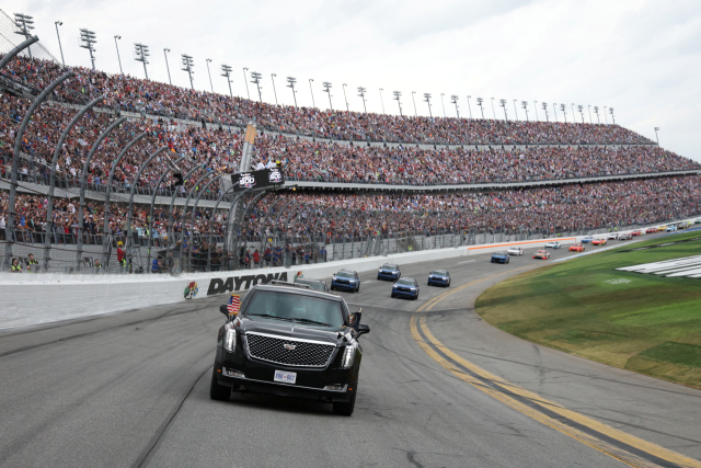 도널드 트럼프 대통령이 지난 16일 미국 플로리다주에서 ‘데이토나 500’ 레이스에서 환호 속에 입장하고 있다. 이날 트럼프 대통령은 전용 리무진인 ‘더비스트’를 타고 경기 전 트랙을 돌며 지지자들에 화답했다. 로이터연합뉴스
