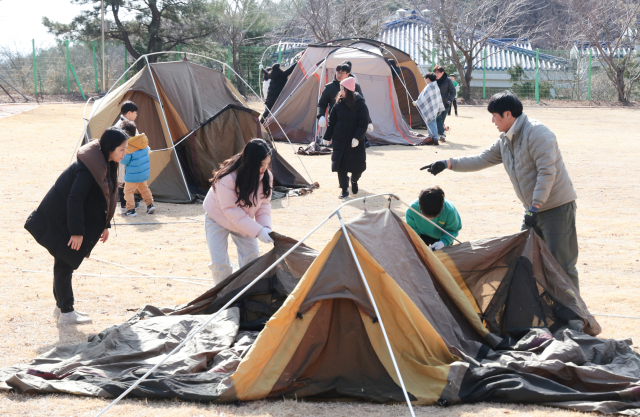 17일 부산 금정구 부산학생인성교육원에서 열린 부모와 자녀가 함께하는 ‘2025년 가족 공감 독서 캠핑’에 참가한 가족들이 텐트를 설치하고 있다. 이번 프로그램은 화목한 가정 문화를 조성하고 가족 중심의 인성교육과 독서 문화를 확산하기 위해 마련됐다.