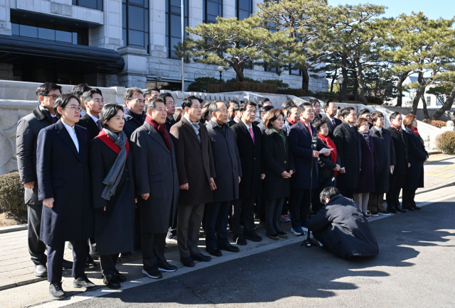 17일 서울 종로구 헌법재판소 앞에서 국민의힘 김기현, 나경원, 윤상현 의원 등 여당 의원들이 윤석열 대통령 최소한 방어권 보장 촉구 및 불공정성 규탄과 관련해 헌법재판소 사무처장을 면담하기 전 기자회견을 하고 있다. 연합뉴스