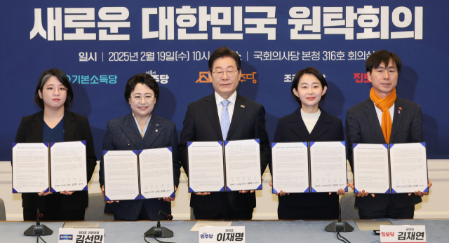 더불어민주당 이재명 대표를 비롯한 야5당 대표들이 19일 서울 여의도 국회에서 열린 ‘내란 종식 민주 헌정 수호 새로운 대한민국 원탁회의’ 출범식에서 공동선언문에 서명 후 기념촬영하고 있다. 왼쪽부터 기본소득당 용혜인 대표, 조국혁신당 김선민 대표 권한대행, 더불어민주당 이재명 대표, 진보당 김재연 상임대표, 사회민주당 한창민 대표. 연합뉴스