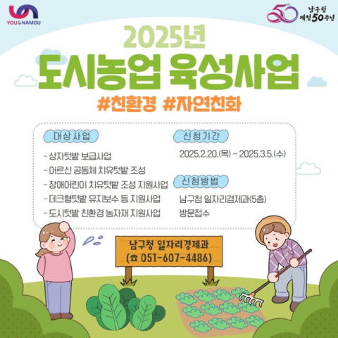 부산 남구(구청장 오은택)는 오는 2월 20일부터 3월 5일까지 도시농업의 다양한 순기능으로 인한 구민들의 삶의 질 향상 및 자연친화적인 도시환경 조성을 위한 ‘2025년 도시농업 육성사업’의 사업대상자를 모집한다.