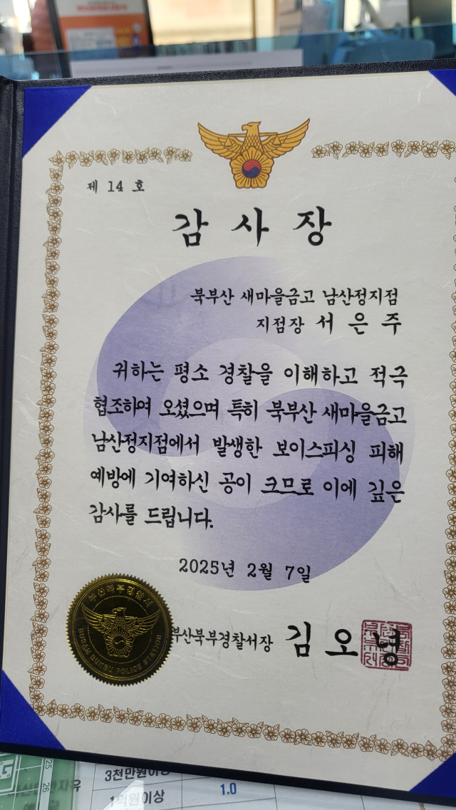 보이스피싱 범죄를 직감하고 기지를 발휘해 피해를 예방한 부산의 한 은행 지점장이 경찰 표창을 받았다.