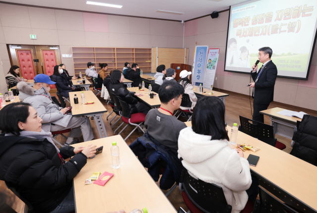 부산시교육청 허남조 유초등교육과장이 학부모를 대상으로 독서 교육에 대한 강의와 함께 부산시교육청 독서 체인지 프로그램을 소개하고 있다. 정대현 기자