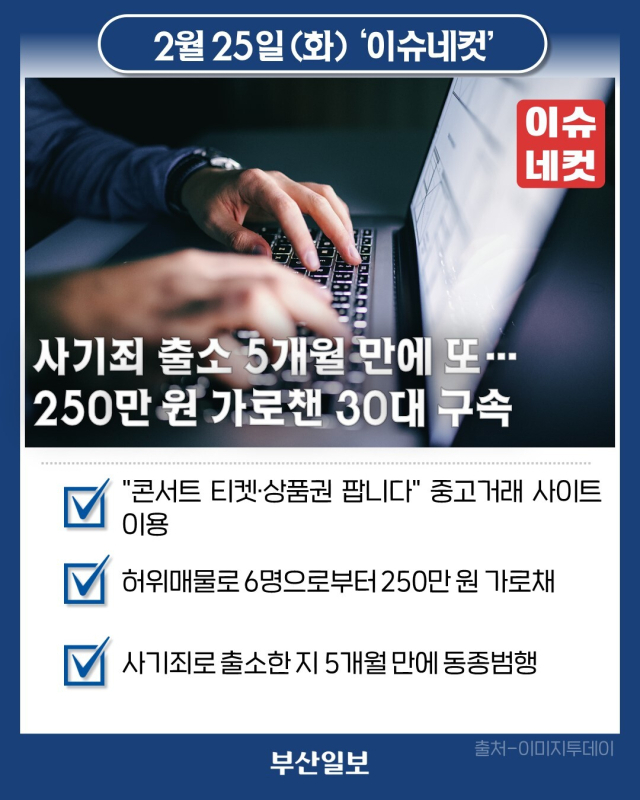 중고거래 사이트에 상습적으로 콘서트 티켓·상품권 등 허위 매물을 올려 6명으로부터 250만 원을 가로챈 30대 A 씨가 구속됐습니다. 광주 서부경찰서에 따르면 A 씨는 같은 범행으로 징역형을 선고받고 복역하다가 출소한 지 5개월 만에 동종범행을 저질렀습니다. 구매 비용을 계좌로 이체했으나 물품을 전달받지 못한 피해자들의 신고로 A 씨는 지난 20일 경찰에 붙잡혔습니다. 경찰은 누범기간 범행을 저지른 A 씨를 상대로 여죄 여부 등도 수사하고 있습니다.