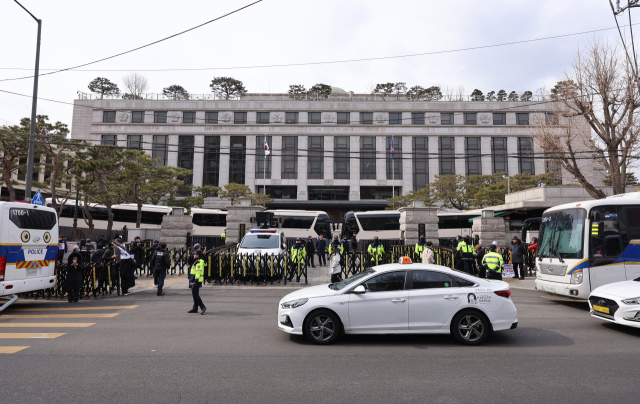 윤석열 대통령 탄핵심판 11차 변론이 열리는 25일 서울 종로구 헌법재판소 인근에 경찰 버스들이 주차돼 있다. 연합뉴스