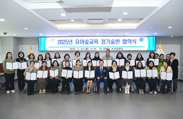 부산 연제구(구청장 주석수)는 지난 24일 구청 대회의실에서 26개 유치원·어린이집 관계자들이 참석한 가운데 ‘유아숲교육 정기숲반 협약식’을 가졌다.