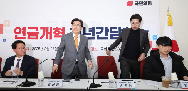 국민의힘 권성동 원내대표(왼쪽 두번째)가 25일 서울 여의도 국회에서 열린 연금개혁 청년간담회에서 손영광(오른쪽 두번째), 김상종 연금개혁청년행동 공동대표 등과 착석하고 있다. 연합뉴스