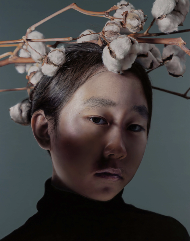 최근 몇 년간은 인물화에서 확장된 목화 시리즈를 선보이고 있다. 작가는 목화를 보며 돌아가신 어머니를 떠올렸다. 목화의 부드러운 솜털이 어머니의 하얗게 센 머리카락 같았고, 솜을 받치고 있는 쪼글쪼글한 잎사귀는 갖은 고생을 겪으며 자식을 키워낸 어머니의 손을 닮았다. 목화는 꽃이 지고 나서 열매를 맺고, 그 열매의 꼬투리가 터지면서 흰 솜털을 드러낸다. 목화로 상징되는 어머니와 딸을 한 화면에 담아 세대를 아우르는 가족의 의미를 표현하고 싶었다. 신비한 아이의 표정, 머리 위에 있는 목화는 포근함이 느껴진다. 인물만 그렸던 작가에게 특정 사물을 주요하게 다루는 것은 큰 도전이었지만, 화면 속 무게감이 분산되지 않고 균형을 이루며 작품은 완성됐다.