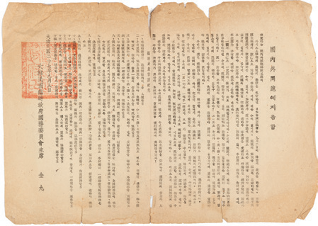대한민국임시정부는 1945년 9월 3일 중국 충칭에서 대한민국임시정부 국무위원회 주석 김구 명의로 '국내외 동포에게 고함'이라는 성명을 발표했다. 국립대한민국임시정부기념관 제공