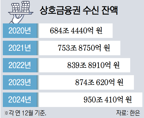 한국은행 경제통계시스템에 따르면 상호금융권(새마을금고·신협·농협·수협·산림조합) 수신 잔액은 작년 12월 기준 905조 410억 원으로 집계됐다. 이는 1년 전(874조 620억 원) 대비 30조 9790억 원 늘어난 수치다.