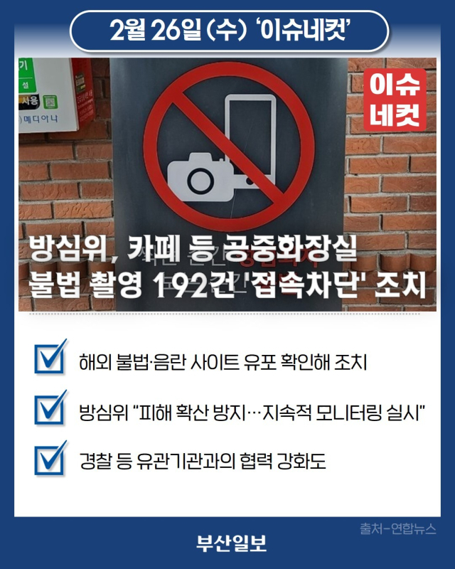 방송통신심의위원회는 최근 디지털성범죄심의소위원회를 열고 화장실 불법 촬영물 192건에 대한 접속을 차단하기로 결정했다고 밝혔습니다. 방심위는 최근 보안에 취약한 카페와 대학교, 회사 등의 공중화장실에서 불법 촬영된 영상 등에 대한 모니터링을 실시해 이 같은 불법 촬영물이 해외 불법·음란 사이트를 통해 유포된 것을 확인하고 조치했다고 전했습니다. 그러면서 "피해 확산을 방지하기 위해 지속적인 모니터링을 할 예정이며, 경찰 등 유관기관과의 협력도 더욱 강화할 것"이라 덧붙였습니다.