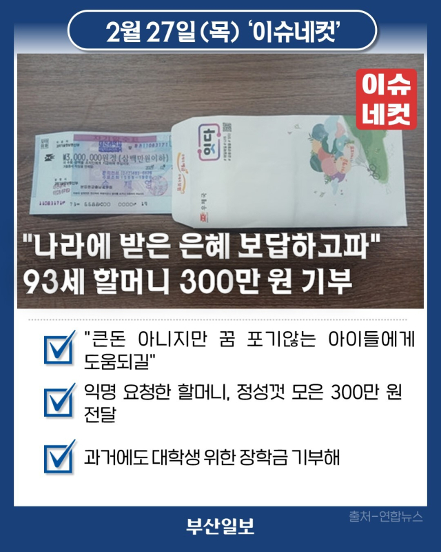 "나라에 받은 은혜 보답하고파" 93세 할머니 300만 원 기부