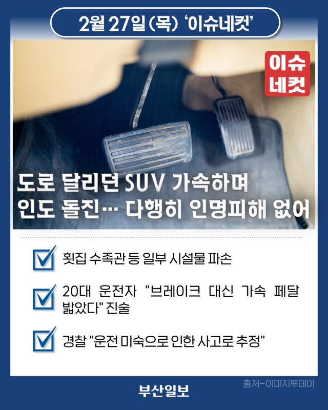 도로를 달리던 SUV 차량이 인도로 돌진하는 사고가 발생했습니다. 27일 오전 9시 50분께 인천시 서구의 한 이면도로에서 20대 A 씨가 몰던 SUV 차량이 갑자기 속도를 높이며 인도로 돌진했습니다. 이 사고로 인명 피해는 없었으나, 인근 횟집 수족관을 포함해 일부 시설물이 파손됐습니다. 경찰 조사에서 A 씨는 "브레이크 대신 가속 페달을 밟았다"는 취지의 진술을 한 것으로 알려졌습니다. 경찰은 "운전 미숙으로 인한 사고로 보인다"며 "현장 CCTV를 확인하는 등 구체적인 사고 경위를 조사하고 있다"고 밝혔습니다.