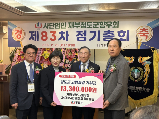 (사)재부청도군향우회(회장 박국현)는 지난달 25일 제83차 정기총회에서 경북 청도군에 고향사랑기부금 1330만 원을 전달했다.