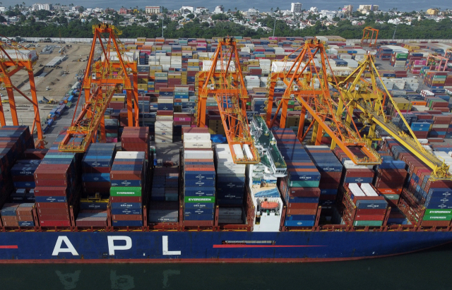멕시코 만자니요 항구에서 수출 컨테이너 선박이 정박해 있는 모습. 연합뉴스