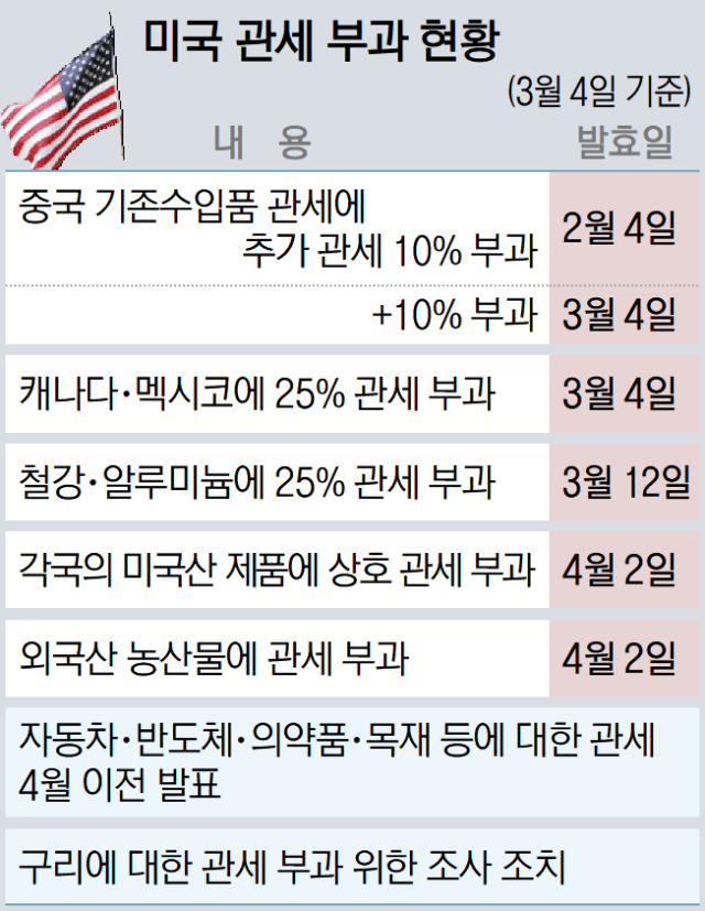 트럼프 미국 대통령이 한 달간 관세 부과를 미뤘던 캐나다와 멕시코에 대해 4일(현지 시간)부터 예정대로 25% 관세를 매기겠다고 밝혔다. 중국에 대해서도 추가 관세를 10% 부과한다고 밝혔고 미국이 수입하는 외국산 농산물에 대해서도 관세를 매길 것이라고 말했다. 이에 따라 4일 0시 1분부터 미국의 신규 관세는 발효됐다.