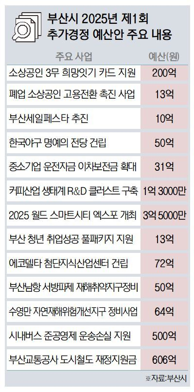 부산시는 이번 추경예산안을 지방교부세 2629억 원, 국고보조금 295억 원을 재원으로 총 3612억 원 규모로 편성했다. 본예산 16조 6830억 원 대비 2.2% 증가해, 추경 총 예산안은 17조 442억 원이다.