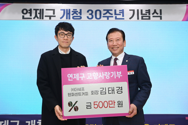 (주)더쉐프 텐퍼센트커피(회장 김태경)는 지난 4일 부산 연제구(구청장 주석수) 개청 30주년 기념식에서 고향사랑기부금 500만 원을 전달했다.