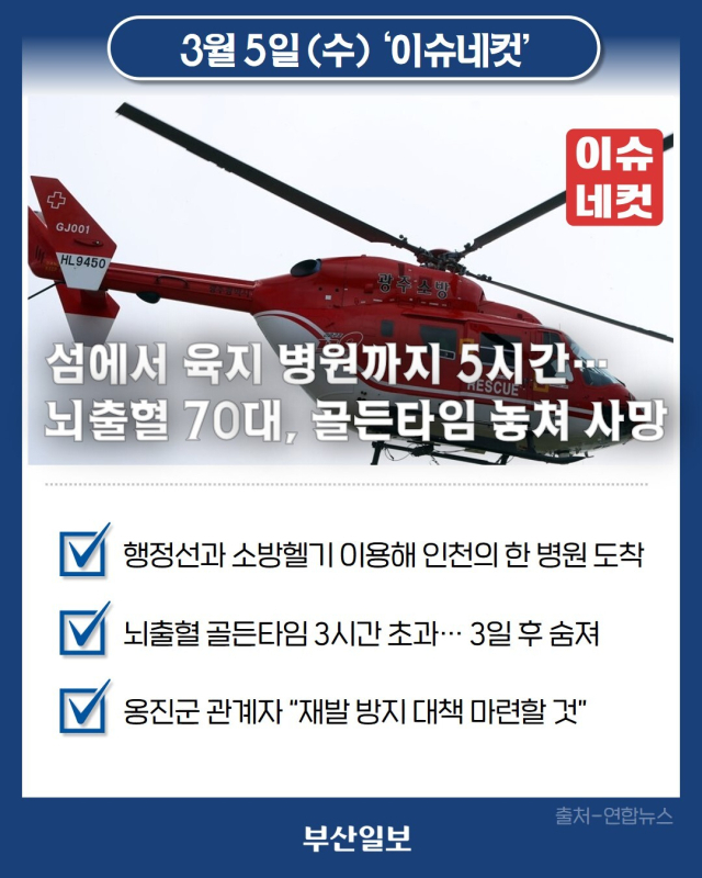 섬에서 육지 병원까지 5시간… 뇌출혈 70대, 골든타임 놓쳐 사망