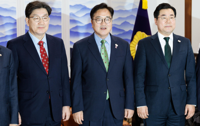 우원식 국회의장과 국민의힘 권성동 원내대표(왼쪽), 더불어민주당 박찬대 원내대표(오른쪽)가 4일 서울 여의도 국회에서 의장 주재 회동에 참석해 기념 촬영하고 있다. 연합뉴스