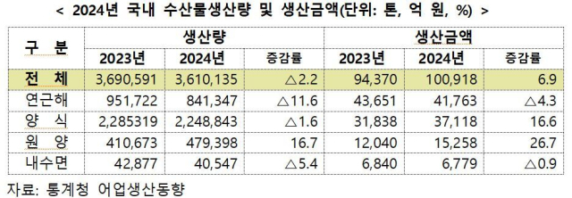 해양수산부는 2024년 국내 어업(수산물) 총생산량이 361만t(톤)으로 전년(369만t) 대비 2.2% 줄었다고 5일 밝혔다. 어업 생산금액은 김 가격 상승 등의 영향으로 6.9% 늘어난 10조 918억 원으로 집계됐다.