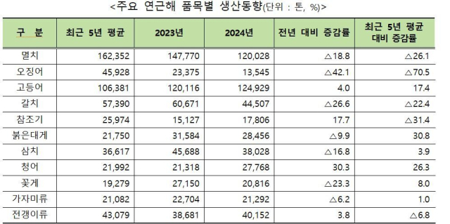 주요 어종별로 보면 오징어 생산량은 1만 3000t으로 전년대비 -42.1% 급감해 감소율이 가장 컸다. 갈치는 4만 4000t(-26.6%), 꽃게는 2만t(-23.3%), 멸치는 12만t(-18.8%), 삼치류는 3만 8000t(-16.8%), 붉은 대게는 2만 8000t(-9.9%), 가자미류는 2만 1000t(-6.2%)으로, 이들 어종은 전년보다 생산량이 줄었다. 반면 청어는 2만 7000t(30.3%), 참조기 1만 8000t(17.7%), 고등어 12만 5000t(4.0%), 전갱이류 4만t(3.8%) 등으로, 이들 어종 생산량은 전년 대비 늘었다.