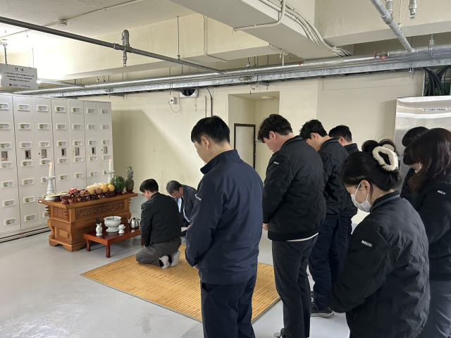 부산영락공원 직원들이 지난 5일 일제강점기 강제노역 희생자 등을 위해 평안제를 진행하고 있다. 부산시설공단 제공