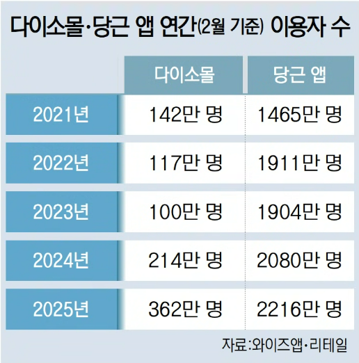9일 앱·리테일 분석 서비스업체 와이즈앱·리테일에 따르면 다이소몰과 온라인 중고 거래 플랫폼 당근 앱의 이용자 수가 역대 최대치를 기록했다. 지난달 다이소몰 이용자는 362만 명으로 전년 동월(214만 명)보다 69% 증가했다. 2021년 2월 142만 명에서 2023년 2월 100만 명까지 줄었으나 지난해부터 사용자가 급증했다.