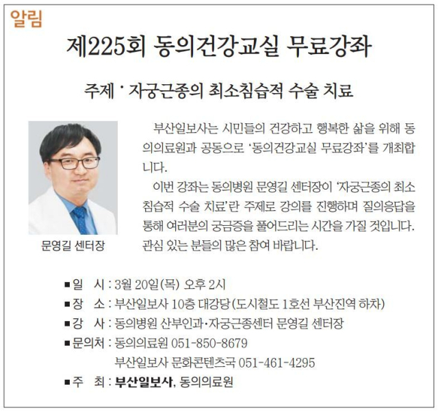 이번 강좌는 동의병원 문영길 센터장이 ‘자궁근종의 최소침습적 수술 치료’란 주제로 강의를 진행하며 질의응답을 통해 여러분의 궁금증을 풀어드리는 시간을 가질 것입니다. 관심 있는 분들의 많은 참여 바랍니다.