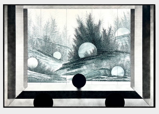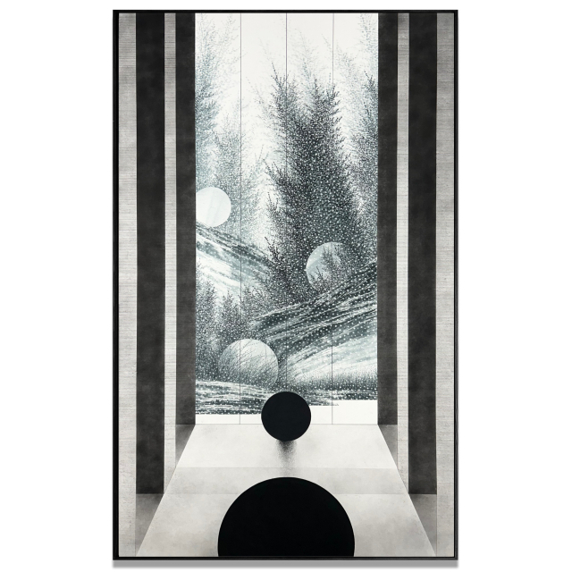 박 작가의 작품은 기존 수묵화와 확연히 다른 매력이 있다. 통창의 현대적인 건물, 직선의 계단 아래, 혹은 창밖에는 둥근 구체들이 있다. 숲이 펼쳐지고 눈이 내리기도 하고 눈이 가득 쌓인 언덕에 구체를 밀고 있는 사람도 보인다. 구체는 검은색부터 명도가 점점 옅어져 회색, 흰색을 띠기도 한다. 종이를 뜯어내 눈을 표현했고 작은 인물들은 따로 그림을 오려서 붙였다. 작지만 입체적인 느낌이 나는 것도 이런 기법 때문이다. 흔들리는 나무의 질감은 회화가 아니라 영상처럼 느껴지기도 한다.
