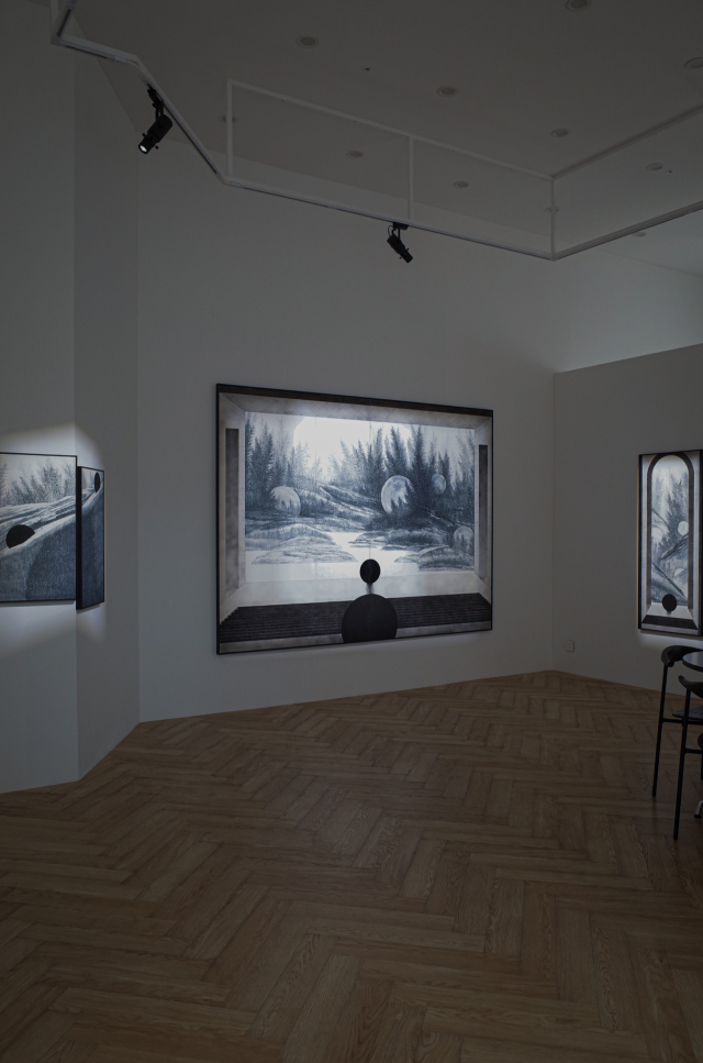 “구체는 기억 덩어리 같은 존재입니다. 선명한 검은색은 생생한 현재의 기억을, 연해지는 색은 희미해지고 사라진다는 뜻입니다. 창은 풍경으로서 단순한 장치가 아니라 현재와 과거를 잇는 경계이며, 안과 밖을 나누는 틀이자 개인과 세계를 이어주는 매개인 셈이죠. 창 너머 흐려지는 풍경을 바라보면, 사라져가는 것들 속에서 남겨진 존재를 떠올리게 합니다.”