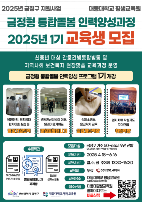 대동대학교(총장 민경화) 평생교육원은 금정구(구청장 윤일현)의 2025년 지방소멸대응기금 사업의 일환으로 2024년부터 운영해 온 ‘지역사회 신중년 맞춤 금정형 통합돌봄 인력양성’ 사업을 계속 추진한다고 지난 5일 밝혔다.